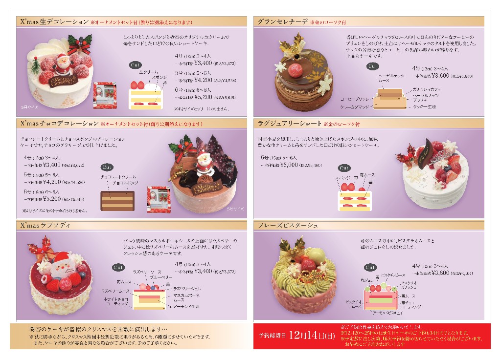 *特殊ケーキ(プリント等)また小物ケーキのご予約はご容赦ください。